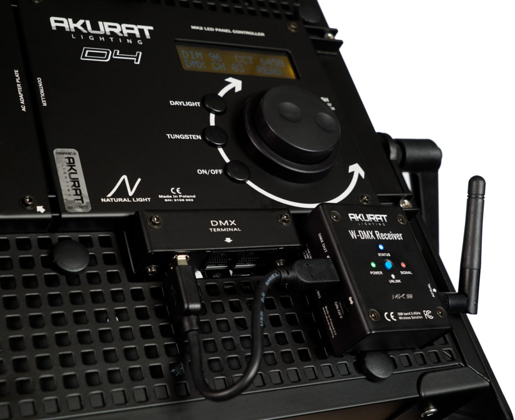 Część nadawcza Akurat W-DMX współpracuje z każdym sterownikiem oświetlenia DMX, zgodnym ze standardem DMX512-A. Moduły odbiorcze Akurat W-DMX zostały zaprojektowane do współpracy z panelami LED Akurat MK2, ale system umożliwia przyłączenie sygnału do dowolnej oprawy oświetleniowej, zgodnej ze standardem DMX