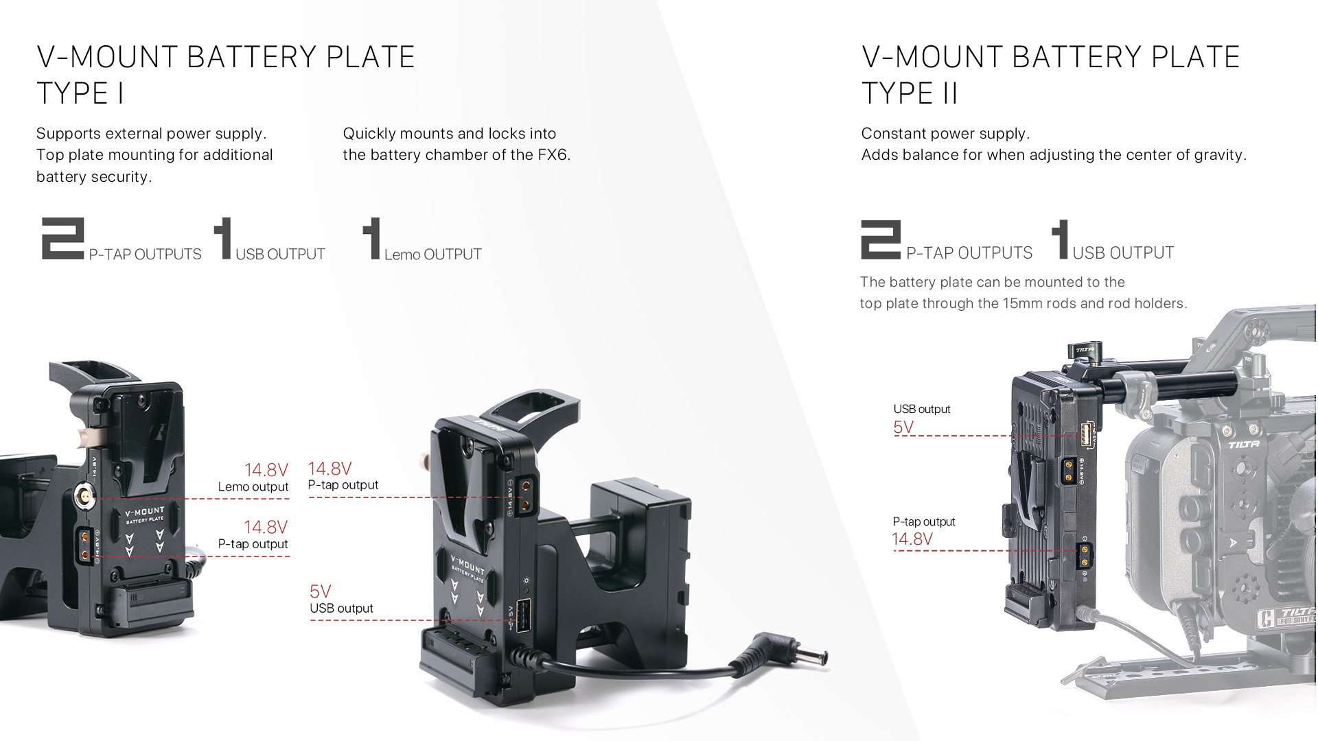 Wbudowany wspornik adaptera obiektywu oraz bezprzewodowy uchwyt montażowy wideo dodają funkcjonalności, a płytkę baterii do Sony FX6 V-Mount Type I można łatwo zamontować i zabezpieczyć.
