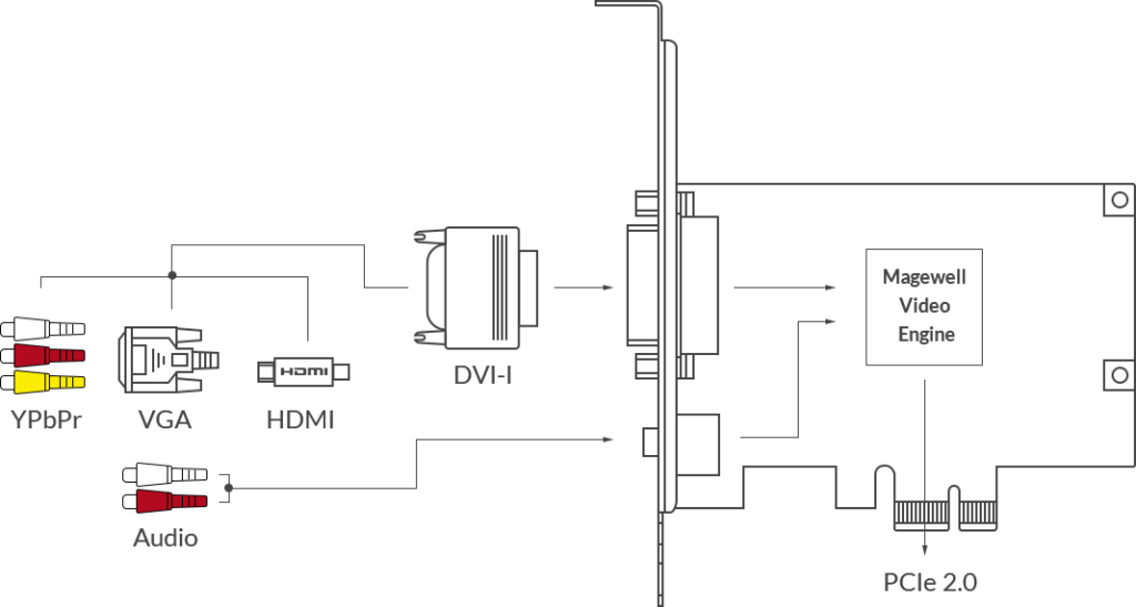 To karta przechwytująca, która obsługuje wejścia DVI z dźwiękiem, VGA z dźwiękiem, komponentowe z dźwiękiem oraz HDMI z osadzonym dźwiękiem lub dźwiękiem analogowym.