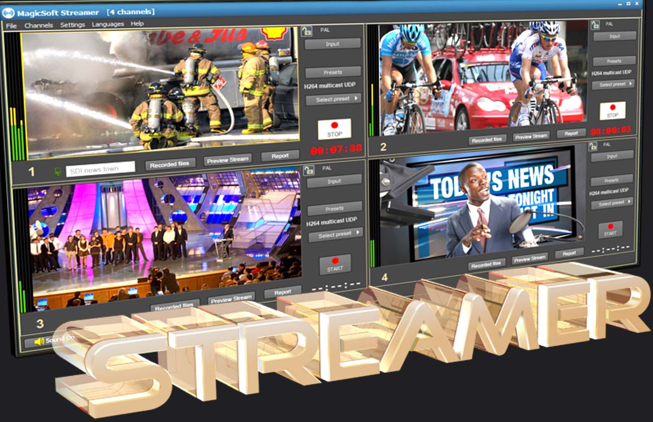 MagicSoft Streamer – profesjonalne narzędzie do live IP streaming, umożliwiające dystrybucję i contribution. Obsługuje do 4 wejść wideo, kompresję MPEG2/H.264 i strumieniowanie UDP/RTP/RTMP do platform takich jak YouTube, Twitch, Wowza i inne.