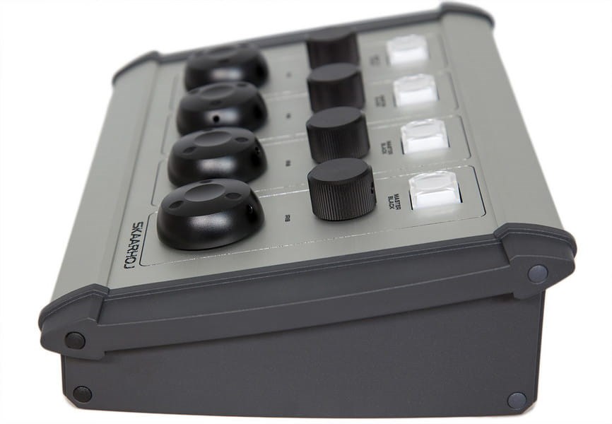 Skaarhoj CCU Lite łączy się z dowolnym mikserem ATEM przez ethernet i umożliwia jednoczesne sterowanie 4 kamerami Blackmagic z serii Studio lub URSA Mini. Duże, aluminowe pokrętła dają łatwą kontrolę nad przysłoną i poziomem czerni, zaś podświetlane przyciski pozwalają na wybór kamery. Specyfikacja oraz wideo instruktaż: http://skaarhoj.com/designs/atem-ccu-lite-for-bmd-studio-cameras/