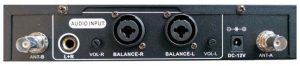 Odbiorniki bodypack zasilane są dwiema bateriami AA, które pozwalają na nieprzerwaną pracę nawet do 8 godzin. W górnej części obudowy umieszczono: