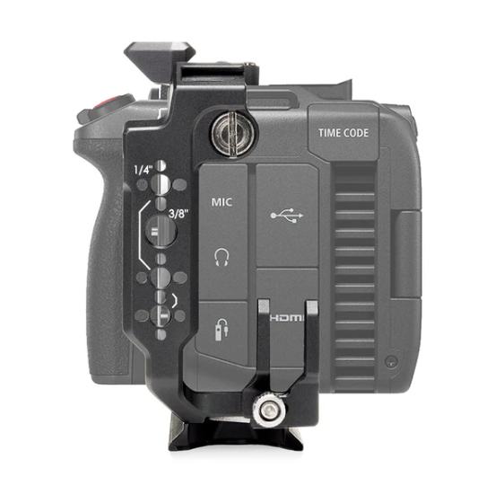 Kamera mocowana jest w klatce za pomocą wytrzymałej śruby 1/4″-20, co gwarantuje stabilne i pewne połączenie podczas pracy handheld lub na statywie. Konstrukcja klatki pozwala zachować pełny dostęp do wszystkich elementów sterujących, portów wejścia/wyjścia, slotu kart pamięci i komory baterii. Wszystkie drzwi, blokady i gniazdo hot shoe pozostają w pełni funkcjonalne, eliminując konieczność demontażu kamery podczas pracy.
