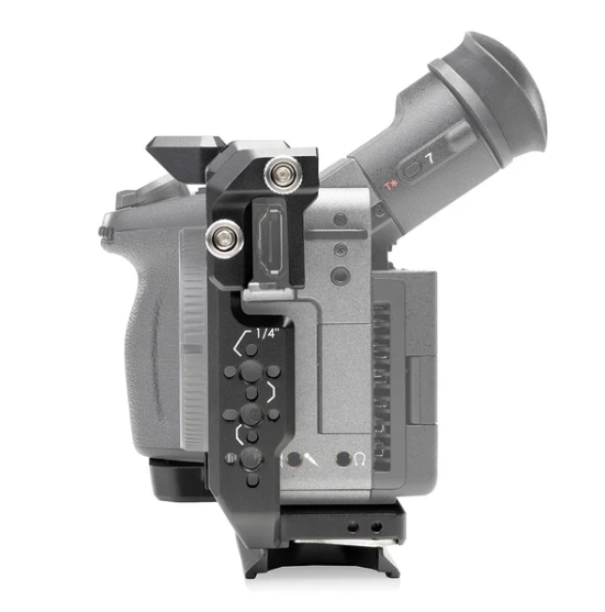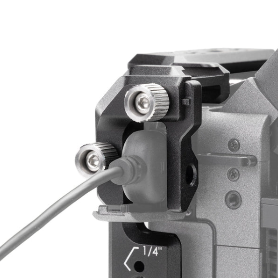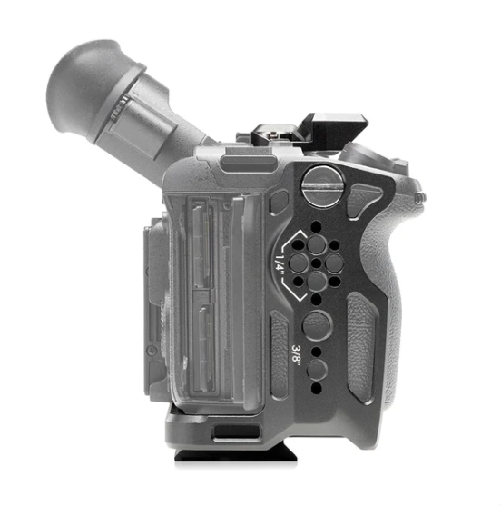 Kamera montowana jest w klatce za pomocą śruby 1/4″-20, co gwarantuje stabilne i bezpieczne osadzenie korpusu. Konstrukcja została zaprojektowana tak, aby zachować pełny dostęp do wszystkich najważniejszych elementów kamery — przycisków, portów wejścia/wyjścia, slotów kart pamięci oraz komory baterii.
