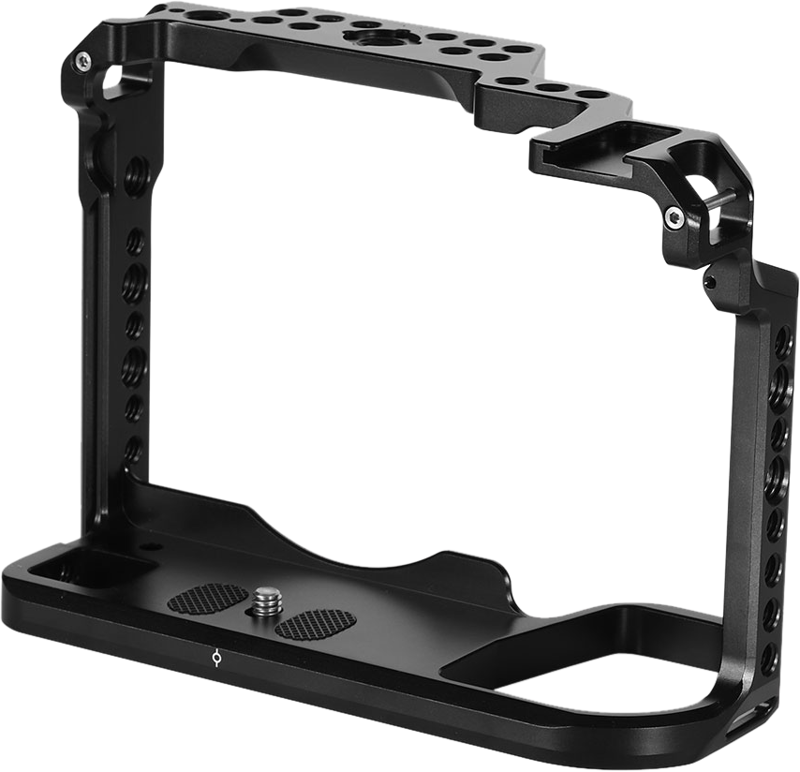 Na dolnej części klatki znajdują się gwinty 3/8″-16 i 1/4″-20 do montażu na płycie statywu, a także wbudowany płaski śrubokręt do szybkiego montażu.