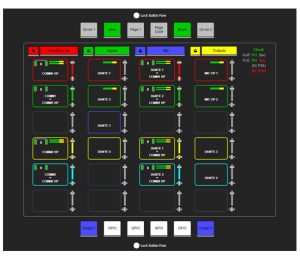 Kolorowy wyświetlacz TFT o rozdzielczości 480 x 107 pikseli, pokazujący stan panoramiczny, poziom, miernik, typ kontrolowany, nazwy źródła/miksera/docelowa i miernik wyjścia głównego