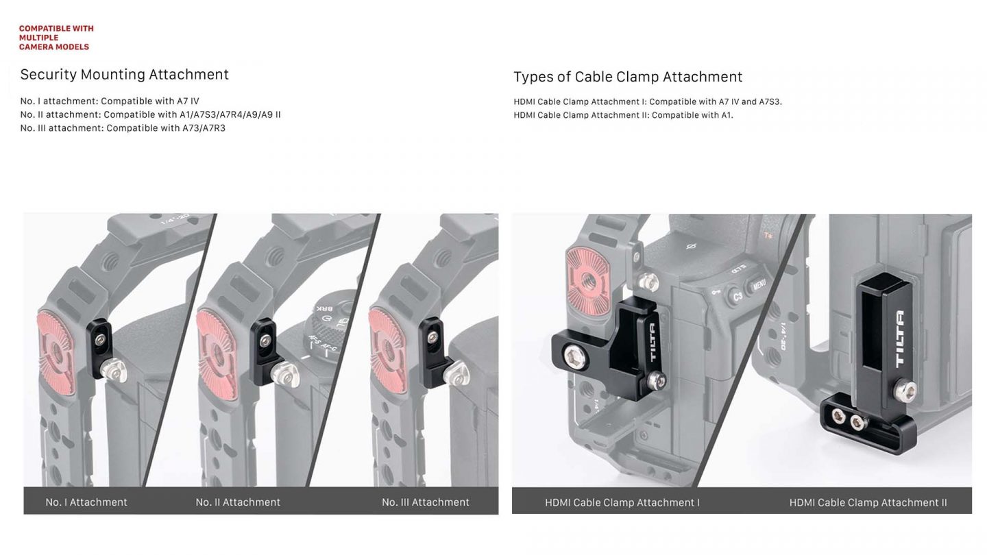 Zestaw zawiera również zacisk HDMI, który mocuje się z boku klatki i pozwala na bezpieczne przymocowanie kabla HDMI. Jest to przydatne, aby uniknąć poluzowania się kabla podczas fotografowania i chronić port HDMI w korpusie aparatu, szczególnie podczas korzystania z zewnętrznego rejestratora.