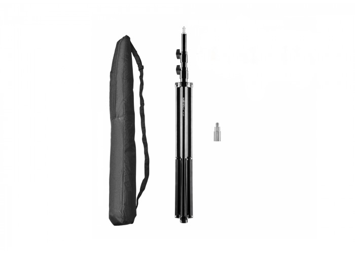 Bezpieczna podstawa statywu lampy, nawet z całkowicie wysuniętymi kolumnami środkowymi, przekonuje w codziennej pracy. Dzięki niewielkiemu ciężarowi wynoszącemu tylko 1,6 kg i kompaktowej wielkości opakowania 98 cm jest szczególnie łatwy do przechowywania i transportu. Segmenty kolumny środkowej są wyposażone w amortyzację sprężynową, która zapewnia bezpieczne opuszczanie poszczególnych elementów. Górny bagnet 5/8 cala (16 mm) jest standardem dla wszelkiego rodzaju sprzętu w przemyśle fotograficznym. Na górze znajduje się standardowy gwint 1/4 cala, na którym można zamocować różne urządzenia z odpowiednim otworem gwintowym. Za pomocą dołączonego adaptera można w tym miejscu użyć również gwintu 3/8 cala. Dzięki regulowanym metalowym blokadom i solidnym komponentom statyw Walimex pro WT-806 jest przeznaczony do długiego użytkowania.