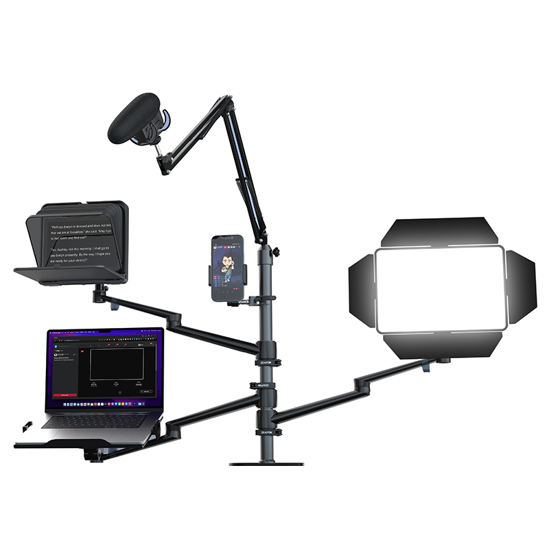 Dzięki unikalnej konstrukcji przypominającej drzewo, Vlogtopus pozwala zaoszczędzić miejsce na biurku. System jest wyposażony w trzy składane ramiona, które można łatwo przymocować do słupka stołowego o wymiarach 43 cm x 3 cm.