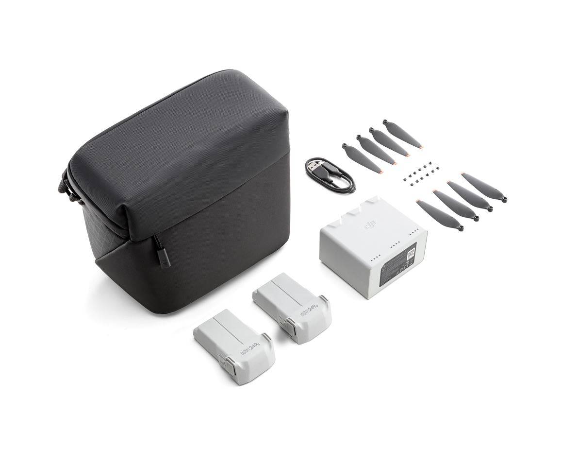 Zestaw DJI Mini 3 Pro Fly More Kit zawiera dwa inteligentne akumulatory, dwukierunkowy hub ładujący, kabel do transmisji danych, torbę na ramię, zapasowe śmigła i śruby, zapewniając kompleksowe wsparcie dla Twojego doświadczenia w fotografii lotniczej, w lepszej cenie niż kupowanie osobno.