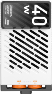 FIVERAY M40 jest zasilana dwoma wbudowanymi akumulatorami 18650 i wspiera szybkie ładowanie PD 55 W. Może działać nawet 29 minut z pełną mocą bez konieczności podłączania do źródła zasilania, a wskaźnik LED informuje o poziomie baterii.
